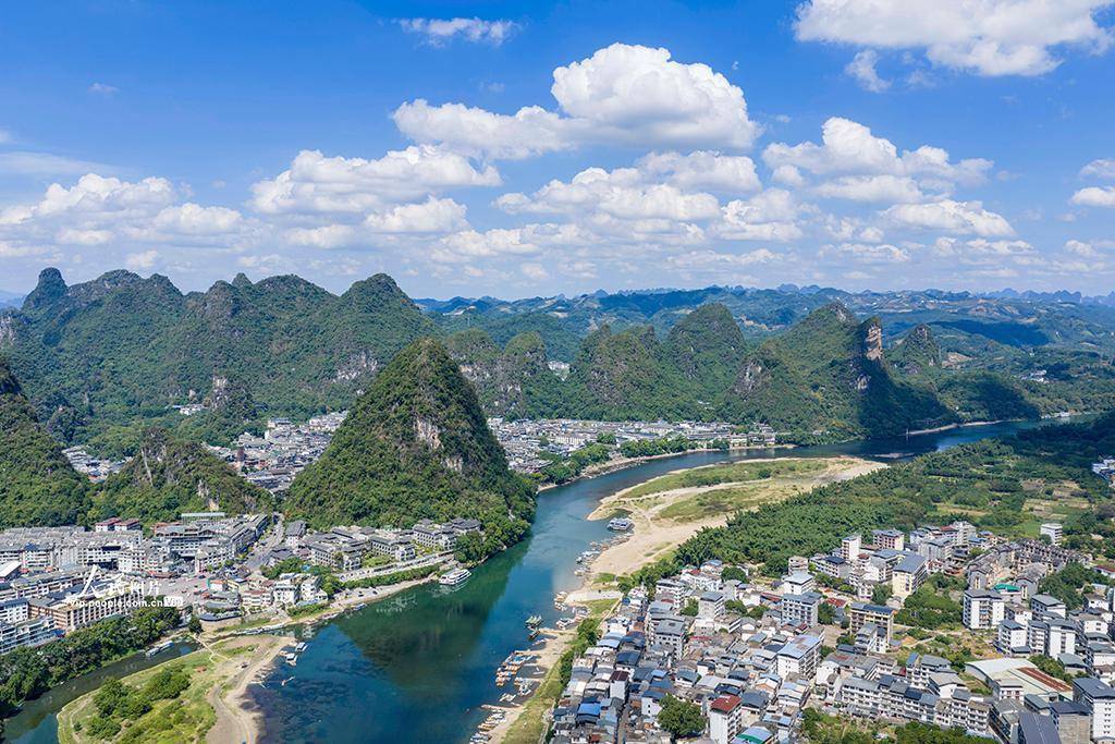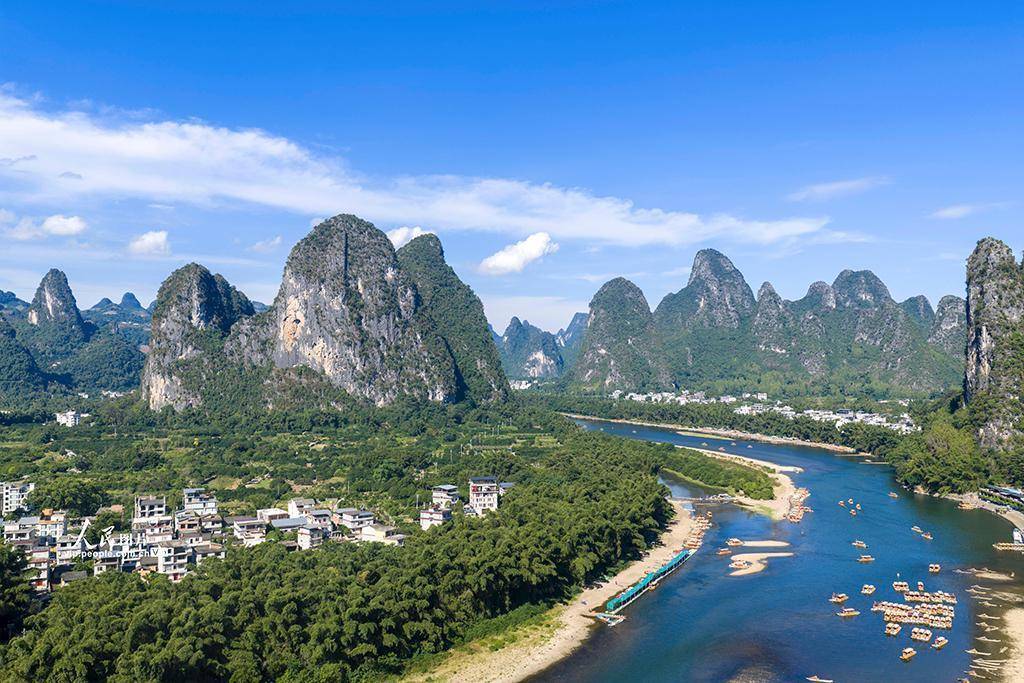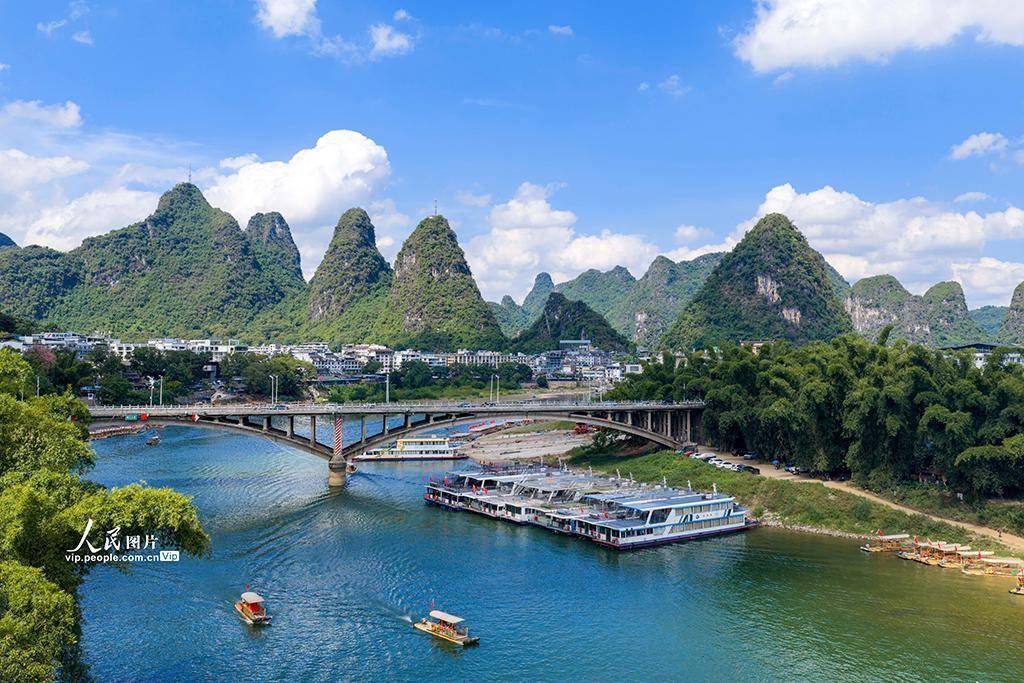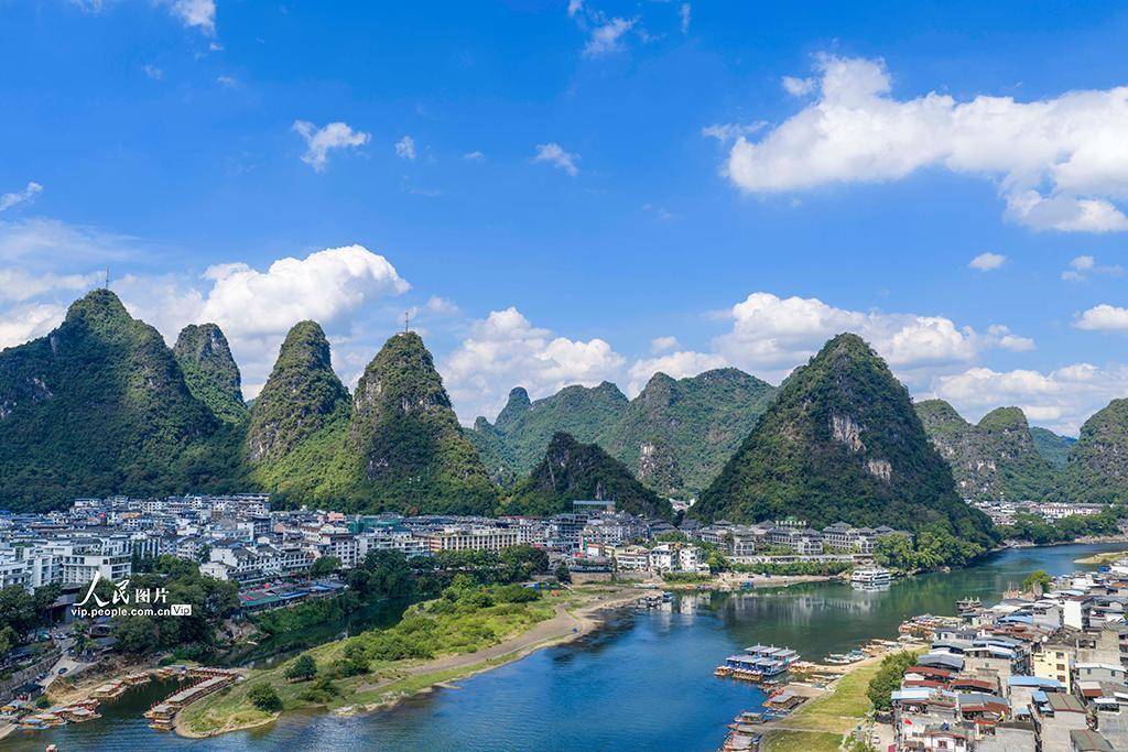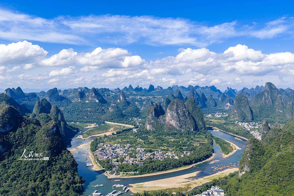 2025年10月7日,广西壮族自治区桂林市阳朔县,漓江碧水萦回,两岸翠竹摇曳,喀斯特峰林与蓝天白云、村庄屋舍相映成趣,宛若一幅流动的山水画卷。夏立慧摄(人民图片网)